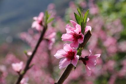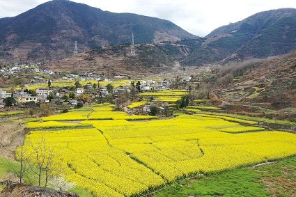 在瀘定縣冷磧鎮、德威鎮等地,桃花、油菜花及櫻花競相開放,一團團、一簇簇,綴滿枝頭,藍天、白云與各色花兒相交,金黃花海在微風中起伏。一畦畦油菜花田錯落有致、層次分明,綿延不斷。“二月櫻花開,三月桃花盛,四月紅櫻桃,五月水蜜桃。”除了油菜花,每年陽春三月,瀘定的桃花也隨著和煦春風落滿枝頭滿樹的花芽沁著香氣,一點點溢到空氣中,香了春風,也香了整座城。