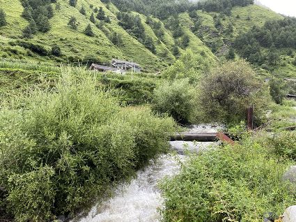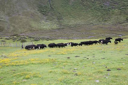 走到一處草坪,南杰和吉美下馬一起去扶雍貝,說是在此處稍作歇息。雍貝的臉色恢復(fù)了紅潤(rùn),他取下盤香枝插進(jìn)吉美濃密的頭發(fā)里,兩人由此發(fā)出了嬉笑聲。馬兒徑自走向草坪深處的水洼里飲水,打著酣暢的響鼻,頸項(xiàng)上銅鈴鐺隨馬兒鬃毛的抖動(dòng)發(fā)出了“鐺鐺”的聲音。馬兒飲飽了水,轉(zhuǎn)身朝我們走來。繼續(xù)騎行,不知過了多久,日光在頭頂上游移,漸漸偏西。雍貝在前方問南杰,阿尺,巴烏牧場(chǎng)還有多遠(yuǎn)?南杰指向眼前的山峰說,登上這座峰頂就到了。回望一路經(jīng)過的河谷,早已不知去向,我們身處的位置幾乎與周遭巍峨的山巒平齊了。我從衣兜里取出手機(jī)測(cè)試海拔高度,4820米。
