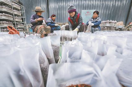 還有村民進了產業園務工。帕他志瑪、扎西翁姆、白瑪、確志、斯郎卓呷都在產業園務工,月平均收入可達3000元以上。在八角樓鄉,像帕他志瑪這樣在“家門口”打工、全家人掙錢的當地村民家庭不在少數。40多位村民在產業園長期就業,100多位村民參與產業園的季節性就業,這都帶動了松茸村、木澤西村、維地村的貧困群眾實現高質量脫貧。現代立體高效食用菌產業的建立讓當地村民第一次嘗到了一天掙上百塊錢的甜頭。