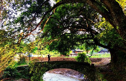 水口小橋流水,古樹蓊郁。村子打開山門,山風(fēng)整裝待發(fā),夏天不遠了。茂盛的地脈樹下,都能看到傘的影子。