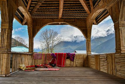 今年72歲的本央老人,是僜人服飾制作技藝西藏自治區級非遺傳承人。在西藏林芝市察隅縣沙瓊村,老人身著傳統的僜人服飾,在自家的涼亭里編織布料。