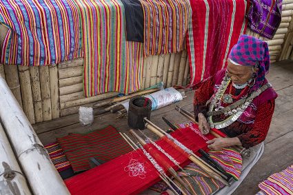 僜人俗稱“僜巴”,是一個生活在我國西藏邊境的族群,人口較少。僜人有自己獨特的語言,生活方式簡樸,起居穿戴有自己的習俗。僜人織品色彩艷麗,主色為紅色、粉紅色,由于沒有圖紙,每位織娘僅憑記憶織出腦海中的花紋,所以每一幅織品都獨一無二。