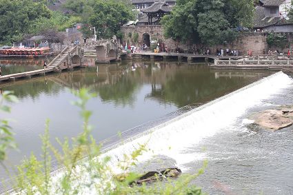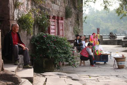 大榮橋。這座建在瀨溪河上、歷經(jīng)數(shù)百年的古石橋,一頭連著大足的地盤,一頭連著榮昌的地盤,故名。看大榮橋的最佳觀景點設在大榮寨對面的萬靈山腰,從那里看大榮橋和橋拱那端毗鄰的大榮寨,一種看白描連環(huán)畫中古鎮(zhèn)的感覺,就冉冉升起了。