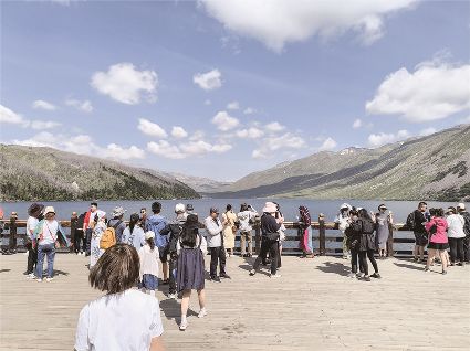 晨曦微露,湖面如鏡子般平靜透亮,倒映著藍天、白云、高山和白雪;傍晚時分,夕陽西下,波光粼粼的湖水如金子般閃耀。