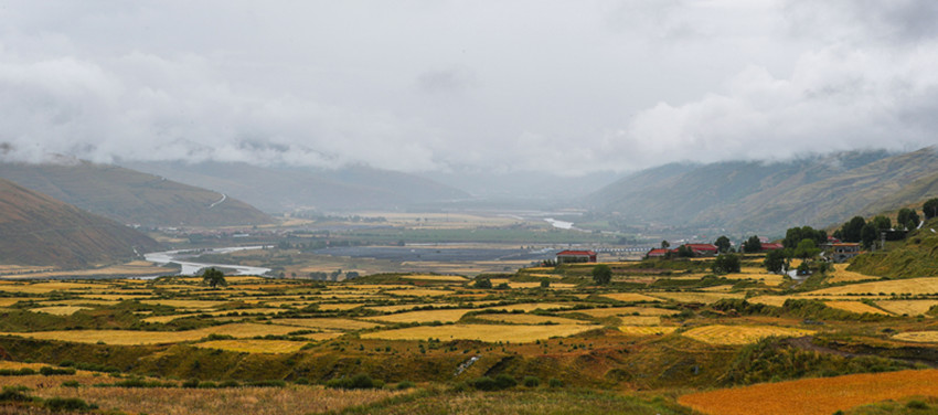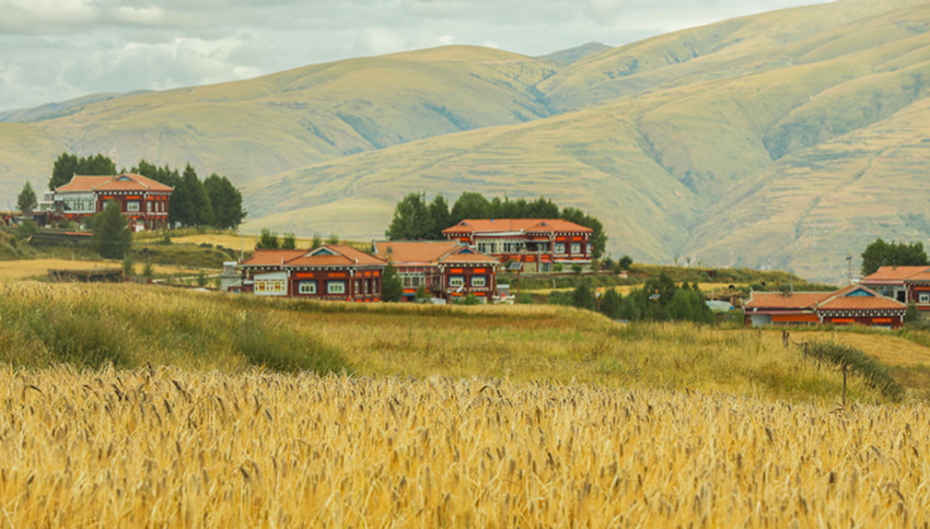 從立秋開始,陽氣漸收,萬物內斂。在希望的田野上,主色調也從象征繁茂、成長的翠綠向代表成熟收獲的金黃漸變。爐霍縣蝦拉沱鎮,藏房零星地點綴在田野間,成熟的農作物漸染了整個秋季,讓這個小村莊如同一幅色彩斑斕的油畫。