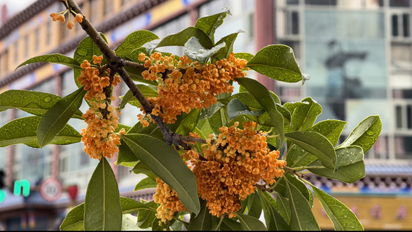 無間纏綿的秋雨后,漫步在巴塘的街道,悠悠的一股香氣沁入心扉。此時,頭頂的藍天,云卷云舒,嬌小的丹桂掛在樹梢枝頭輕輕搖曳,花香詩意相融于高原江南別有意趣。
