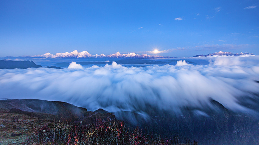 正因為貢嘎雪山具有這樣的特點,一代接一代的攝影人為了看到與眾不同的貢嘎雄姿,不辭辛勞,不斷尋找新的拍攝角度、不同的拍攝機位和發現新的景觀,只為從另一個視覺一睹貢嘎雪山的尊容。