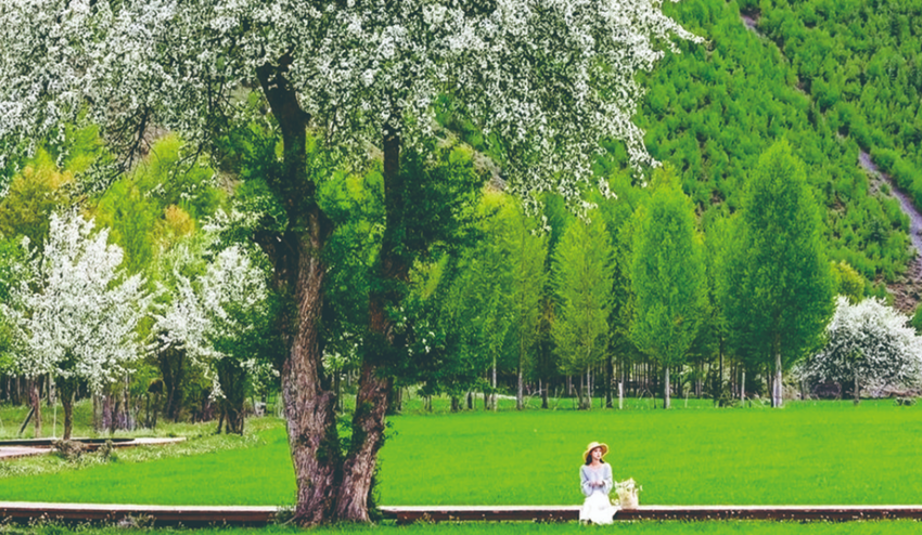 每年5月下旬,貢嘎海棠盛放的甲根壩就瞬間變身為秀美的世外莊園,木雅藏房錯落有致,青稞麥田綠意蔥蘢,潔白的花朵成簇成團,溫暖漫山遍野,微風輕拂,花落成雪,飄滿碧空如洗的天空,花兒灑在田間、落在地頭,在藍色的天空、棕色土壤和青綠色樹葉映襯下,顯得清新至極。