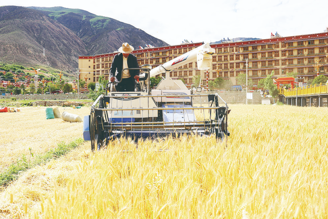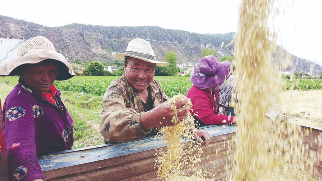 我州各地青稞、小麥陸續進入成熟期,眼下正值“雙搶”關鍵期。放眼望去,在廣袤的田野上,一片熱火朝天的繁忙景象。村民們頭頂烈日,腳踏泥土,緊張而有序地投入到“雙搶”工作中。新型農具為“雙搶”注入強大動力,收割機在田間往來穿梭,一顆顆飽滿的麥粒從倉門傾瀉而下,源源不斷地被送上拖拉機,將成熟的小麥、青稞迅速收割歸倉,展現出一幅喜慶熱鬧的豐收畫卷。