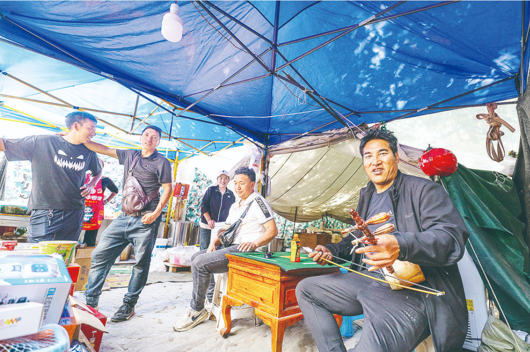 夏邛鎮村民益西一大早就在龍王塘忙碌著,洗菜、切菜、搟面......“又是一年‘央勒節’,今年還是和往年一樣,一邊過‘央勒節’,一邊賣冒面。”他將藍色帳篷簡單劃分成休息區、餐食區、廚房區3個區域,“上午準備好食材,下午和大家一起迎‘央勒’。”