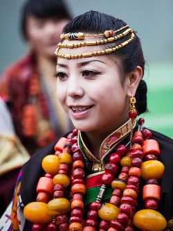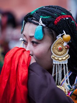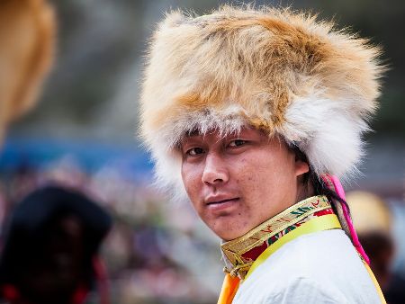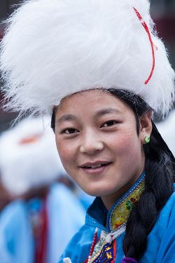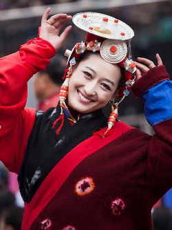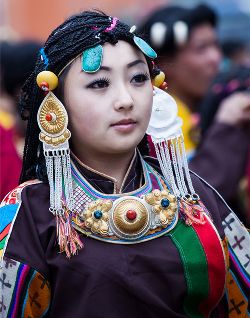 藏裝的基本特點是長袖、寬腰、大襟、肥大。直線寬邊,色彩對比強烈。男女藏袍均習慣以粗紡厚毛呢為料,左襟大,右襟小,一般在右腋下釘一個紐扣,或是用紅、藍、綠、雪青等色布做兩條飄帶,穿時結上。男式藏袍多為黑、白兩色,領圍、袖口、衣襟和底邊,鑲上色布或綢子底邊,古樸渾厚。夏天或勞動時,一般只穿左袖,右袖從后面拉到胸前搭在左肩上,也可左右袖均不穿,兩袖束在腰間,古銅色的皮膚袒露于外,雄風凜凜,彪悍剛健。女式藏袍,分有袖和無袖的兩種,夏秋兩季的藏袍無袖。里面多襯有紅、綠等色彩鮮艷的襯衣,襯衣翻領在外,衣袖要長于胳膊一至二倍,長出部分,平時卷起,舞蹈時放下,舒展飄逸,瀟灑自如。藏族的帽子式樣繁多,各地均有不同,拉薩等地以金寶頂帽為最多,用金絲或銀絲繡織圖案,在陽光照耀下,閃閃發光。金花帽是男女老幼都喜歡戴的民族帽。男女穿的藏靴,底高二寸,靴腰高至小腿以上,靴面用紅綠相間的毛呢裝飾,繡有圖案花紋。靴頭向上隆起。藏族男女喜歡佩飾。耳穿大環,手腕金銀,頂戴珠鏈,尤其是在腰間,男挎長劍,女佩腰刀,更顯得粗獷彪美。