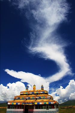 云在天上飄動,影子在大地上掠過,碧綠的草地在云流的映襯下五彩斑斕,猶如一塊巨大的迷彩布,把草地打扮得分外妖嬈。云不墨守成規,每時每刻都有新創意;云有層次的美,有型有款。時刻花樣百出、千奇萬巧的云景,常使人遐想聯翩。我愛高原的云,因為亦真亦幻的云仿佛成了心靈遠游的載體,寄托著人們的留戀與追求。