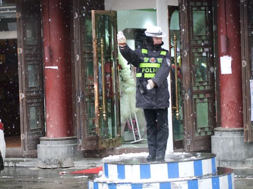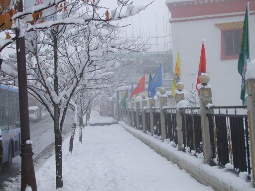 康定秋意正濃,河岸的楊柳還未泛黃,卻意外地迎來了一場不期而遇的降雪,也是今冬康定迎來的第一場雪。大片的雪花輕盈落下,康定城和跑馬山一片銀裝素裹,分外妖嬈。13日早上,康定城依然下著鵝毛大雪。這場深足30厘米的雪,使入冬以來一直持續的干燥空氣變得濕潤,雪景美不勝收,但也給人們出行帶來許多不便。記者在街道上看到車流量和行人明顯減少,機動車都放慢了速度,以確保行車安全。上學的學生,上班的人群都都裹上了厚厚的冬裝,小心翼翼地行走在雪地上。交警依然堅守在紛飛的風雪中指揮交通;環衛工人和一些單位職工迎著大雪清掃馬路和庭院積雪。記者提醒司機,雨雪天氣謹防交通事故,行人要注意因雨雪路面濕滑,謹防摔傷。