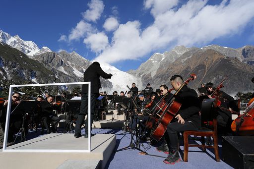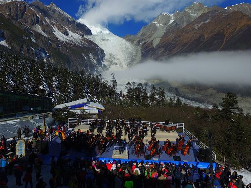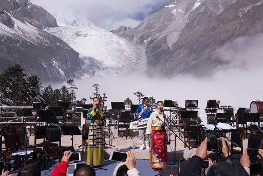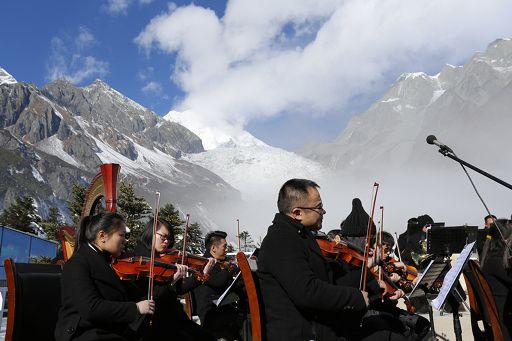四號營地,晴空萬里、風和日麗,清澈的高原天空藍得澄明醉人,來自四川交響樂團和民間的200多位樂手共同在海拔3500米的冰川瀑布之下演奏了《青藏高原》、《向往神鷹》、《菊花臺》等歌曲。