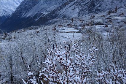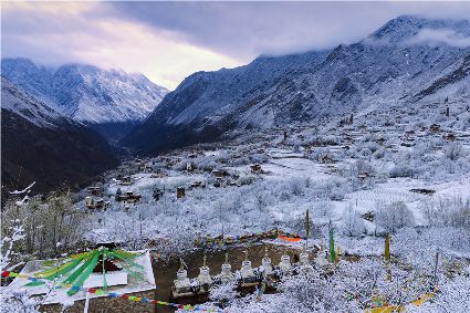 突然,耳畔傳來了誦經聲。山坡下的平臺上,是一排白塔。白塔的周圍,掛滿了經幡。早起的誦經人,沿著中路藏寨的小路來到白塔,一邊轉白塔,一邊虔誠誦經。一年四季的地區稱春雨貴如油,那么旱雨兩季的地區該怎么贊美春雪呢?怕是該稱為春雪貴如金了。祈愿吧——一年好時節,又是一個豐收年!