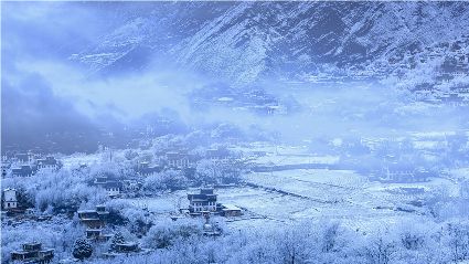 我以這份孤獨和執著,爬上了東邊的山坡。雪停了,微風習習。櫻桃花、桃花在雪枝頭冷艷,淡淡的幽香徐徐浸入心扉。滿眼望去,一片晶瑩,一片潔白。古碉藏寨在這片世界里,寧靜安詳,不容一絲一毫的驚擾。我懷疑自己進入了那種叫做空靈的境界。