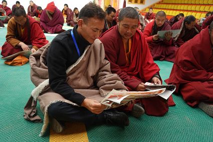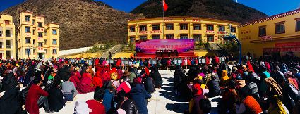 在贈科鄉扎西壩子,卡熱寺、達依寺、祖元寺、打莫寺、邦忠寺等不同教派的寺廟僧人和附近的村民齊聚一堂,聆聽十九大精神宣講。