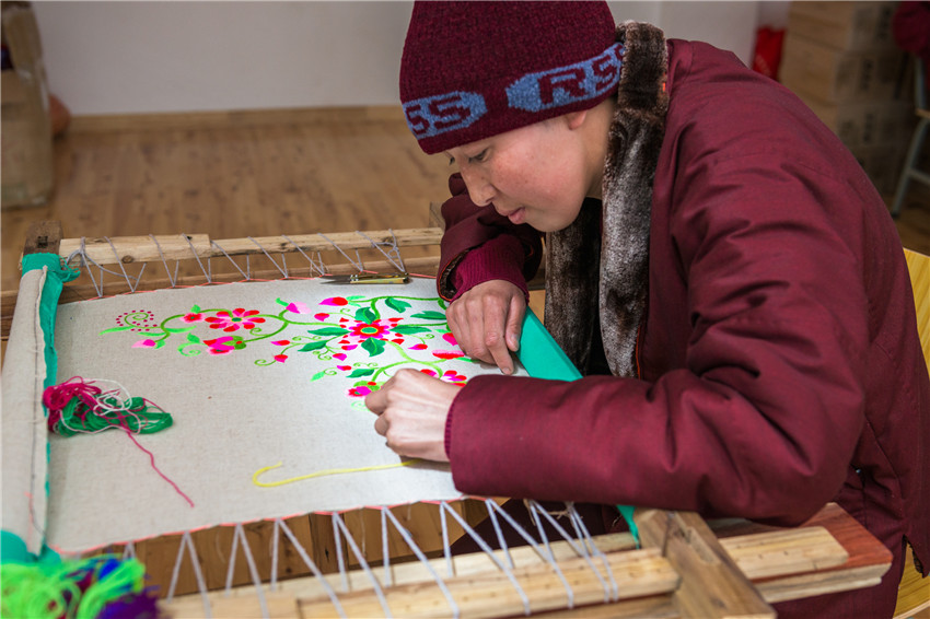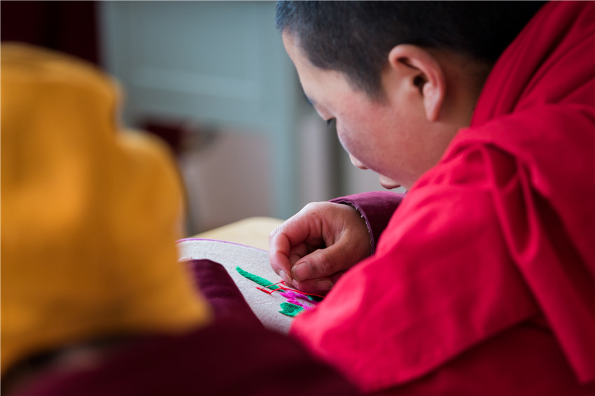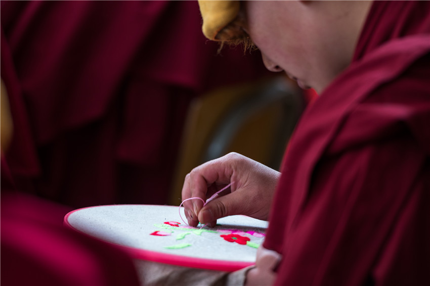 行攝途中經過塔公鎮扎西寺,遇見康定市婦聯邀請到的中國國家級非物質文化遺產藏羌織繡傳承人,正在為自愿報名的數十名覺姆傳授藏繡圖案基礎知識、藏繡圖案的常見表現形態、挑繡、納花繡、鏈子扣、扎花、提花、拼花、勾花和手繡等各種繡法技能。佛教的學習本是無止境的,我被這安靜、專注的場景深深感染,按下相機快門的一瞬就記錄了朵朵盛開在指尖的蓮花。