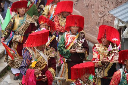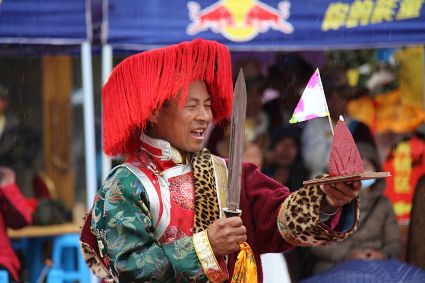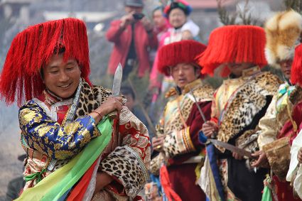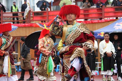 除了歌舞文化,德欽還是民俗文化最大的平臺,神山祭祀是村村寨寨必不可少的活動,在德欽,藏民對山水自然賦予了靈性,認為自然也是和人一樣有著生命和靈性,尊重自然演繹出神山祭祀活動豐富多彩。“刀贊” 藏語稱“百諧”。在德欽農村,刀贊是祭祀活動的重頭戲,這一天,不亞于一個盛大的服飾表演。相傳“百諧”是古時村民為消除戰亂,祈福平安的一項傳統祭祀活動,延續至今已經成為一項傳統的民俗活動。“百諧”既是祭祀活動的一個儀式,也是一個獨立的傳統民俗活動,村里每戶一男丁在這一天必須參加“百諧”。“蘇夏”是村里男人戴的最為隆重的帽子,他不同于金邊帽和狐皮帽。長刀是“刀贊”的道具, “吉祥的日子里,我們一敬天地,賜給我們帶來幸福的生活;再敬尊敬的共產黨,為我們帶來平安吉祥;三敬慈祥的雙親,教會我們如何做一個好人……”朗朗上口的說詞伴著閃閃的刀光起舞,頗具康巴壯士的英武陽剛。