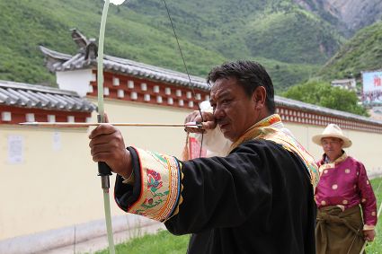 射箭也是德欽以及周邊些村落的重要民俗活動之一,村里的男人們盛裝出場,在射箭場彎弓搭箭,從7、8歲小孩到50多歲的老人都要參加射箭,甭管你射得中靶子與否,笑聲里充滿了和諧和喜慶。德欽縣的江坡村,在每年桃花盛開的季節,都要開展盛大的射箭節,全縣的射箭愛好者都前來一顯身手,康巴漢子們不僅射得一手好箭,還得會拉弦子,悠揚的弦子聲可以給射手們加不少分,活動的初衷就是要求藏族男人必須能文能武。弦子聲聲,唱出了藏家百姓美好的生活,村里的女人戴上了各種金銀首飾,男人們手拉弦子,盡情歡暢的唱著、跳著,村里的老人們是忠實的觀眾,看著大家在舞場里的步子,他們也跟著笑得合不攏嘴,有些年輕人還不時跑出舞場到場邊的老人們面前請教弦子的唱詞,老人們總是不厭其煩的傾囊相授,因為他們曾經也是弦子舞場的“明星”。