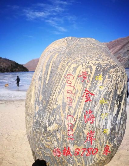 在木格措(野人海)的左邊就是被譽為“愛情灘”的黃金沙灘,很多有情人在這里許下愛情的誓言,草木生靈都作為見證。圍繞海子自然形成的沙灘在高原是很罕見的,當春天來臨,冰面漸漸舒展開,浪花也席卷而來,在黃金海岸,你可以逐浪玩沙。