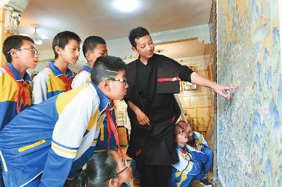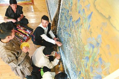 著著是當地小有名氣的畫師,他14歲從臨摹、勾線定型、著色染色開始學起,3年后就出師獨立作畫。17年時間,他繪制了3000多平方米的壁畫和數百幅唐卡,光筆就畫禿了20000多支。去年,著著憑借《南絲路一帶緣藏漢人一家親》成為當年文藝界最高獎山花獎的獲得者。今年,他圍繞“一帶一路、藏漢和睦”為主題而創作的大幅唐卡畫作也即將收尾。