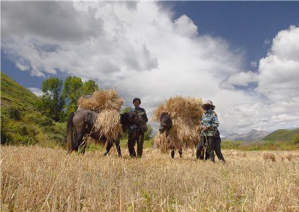 八月起迄,當你翻越西出爐關第一隘口的折多山,下山十里就會看到山地田野里成熟的青稞、麥子象展開一頁頁金黃的詩篇涌進眼里。那大地山坡起伏驛動的金箔等待著走進主人的碉樓……這個時候,正是秋收的開始。