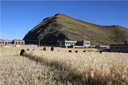 國慶期間,在稻城縣傍河鄉和省母鄉,沉甸甸的青稞穗隨風起伏、頻頻頷首,把喜悅之情傳給這塊土地的主人。