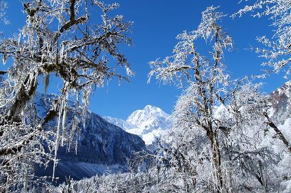 冬季的海螺溝是冬雪仙境、人間至美!海螺溝位于貢嘎雪峰腳下,是“蜀山之王”貢嘎山的門戶,以低海拔現代冰川著稱于世。站在雪后的海螺溝遙望貢嘎神峰,猶如一道冰凝玉砌的天庭界碑,氣勢雄渾直指九霄,雪霧攜祥云共舞峰巔,絕世獨立的山王風范在冰雪仙靈的輔佐下,更顯帝王之氣。