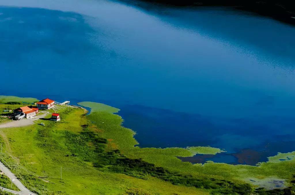 被原始森林和草甸環(huán)抱的五須海,當(dāng)?shù)厝擞鳛椤跋膳釆y的明鏡”,湖水碧綠透亮,將周圍的山水和天空全映照在湖面,幽靜的像一幅畫。從夏到秋周圍百花盛開,古樹盤根錯節(jié)、藤枝攀沿纏繞,杜鵑樹伸向湖面,仿佛進入原始古樸的仙境。