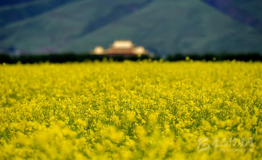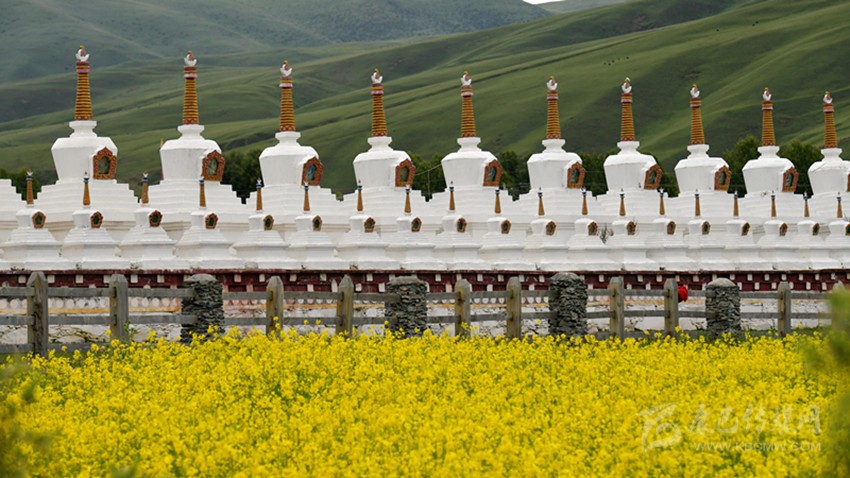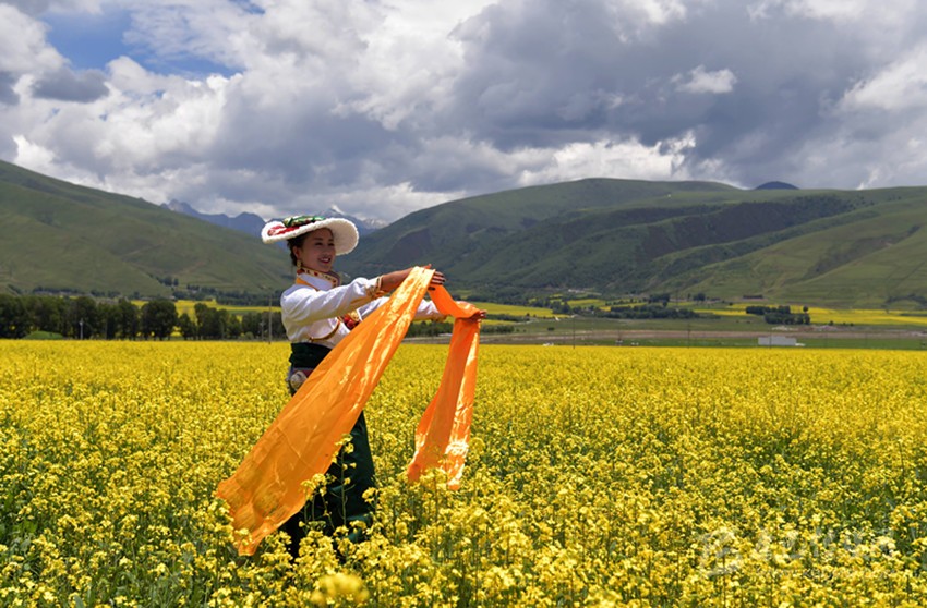 金黃的菜花與青山綠水、藏式民居相融,繪成一幅幅絕美的畫卷。據悉,道孚縣油菜盛花期將持續一個月。“油菜花開滿地黃,叢間蝶舞蜜蜂忙;清風吹拂金波涌,飄溢醉人濃郁香”。在漫山遍野金黃色的油菜花中,掩映著華麗的藏式建筑,使得每一個逃離紛繁城市的人都能找到歸宿。(圖片由中新社記者 劉忠俊 攝)