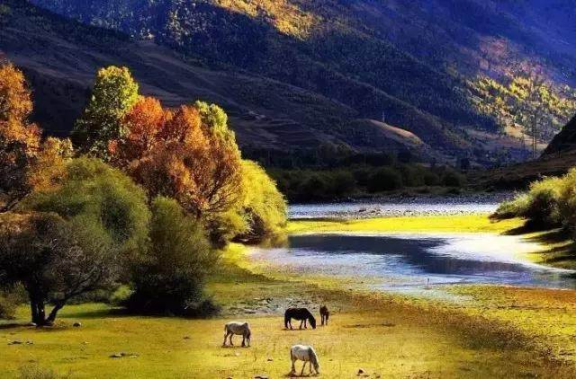 神奇的光線,無垠的草原,彎彎的小溪,金黃的柏楊,山巒連綿起伏,藏寨散落其間,牛羊安詳地吃草……這就是新都橋,令人神往的"光與影的世界"、"攝影家的天堂"。