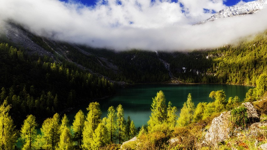 此海子與亞丁景區內的牛奶海最大的不同就是,海子周圍除了有巍峨的雪山,還有成片的森林環繞。