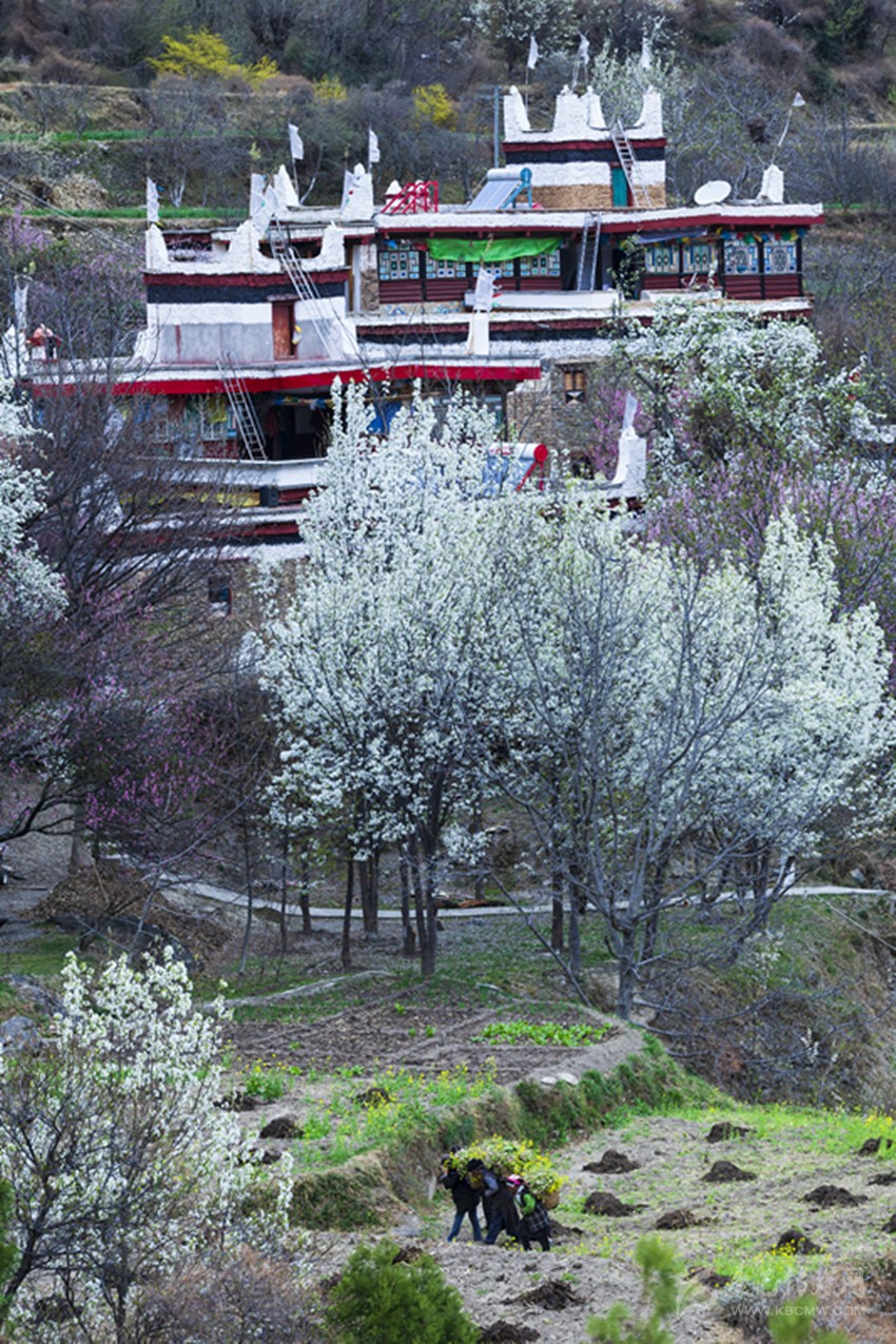 春天的丹巴,碧葉輕蕊,梨花堆雪。房前屋后,山腰山脊皆是滿眼的淡白梨花瓣。暖暖的微風(fēng)吹過(guò),滿樹(shù)的花瓣帶著泥土與花香撲鼻而來(lái)。藏寨、碉樓、繁花,美不勝收。