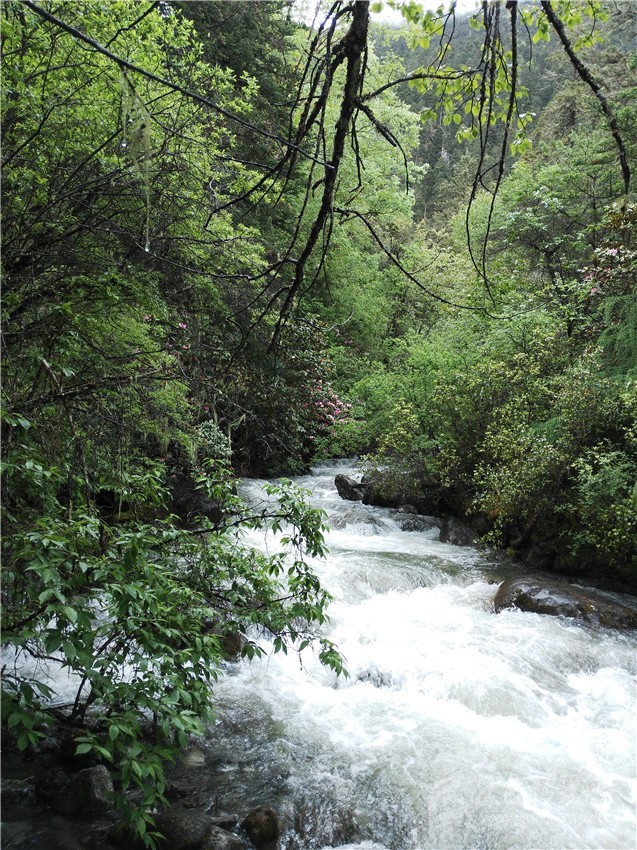 杜鵑花!又有美女的驚叫把我們的視線拉到了另一個方向,也即我們左手山坡上,一大片姹紫嫣紅的杜鵑花正灼灼綻放于郁郁蔥蔥的林木之間。而這時也就發現了,左手邊其實是一片花的海洋,各類不知名的花朵競相爭艷,把拉角溝初晴的時空打扮得格外妖艷。于是眾人紛紛拿出手機兼相機,將這難得一見的景致拍攝下來,而這一過程中,美女們總忘不了騷首弄姿地把自己擺進畫面之中,雖然這些美女都是妖婆級的美女了。至于男士,多數則呵呵笑著看著,頗有閑庭信步、云卷云舒之意。
