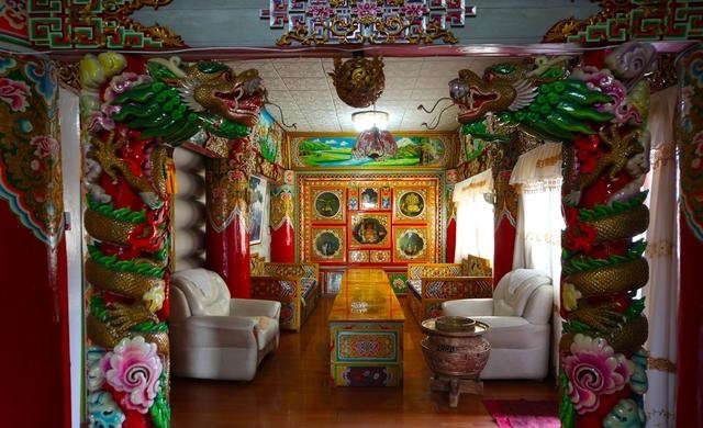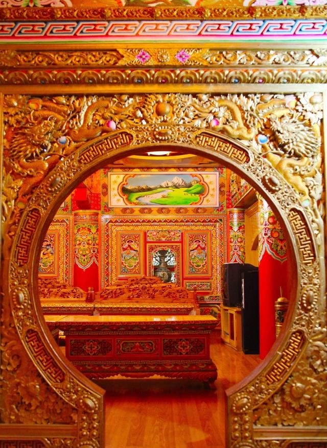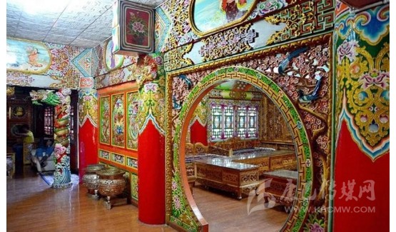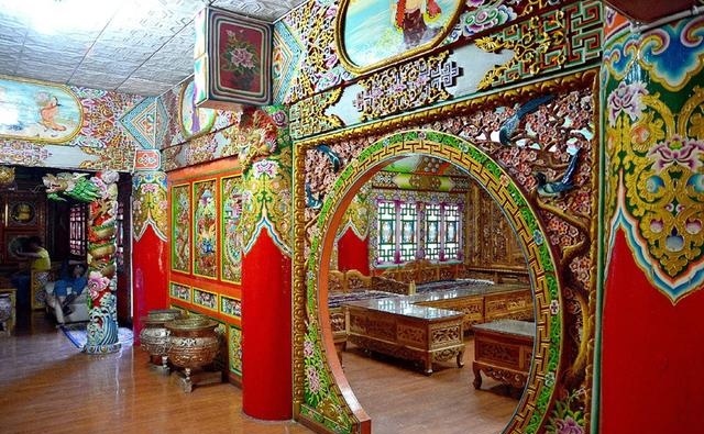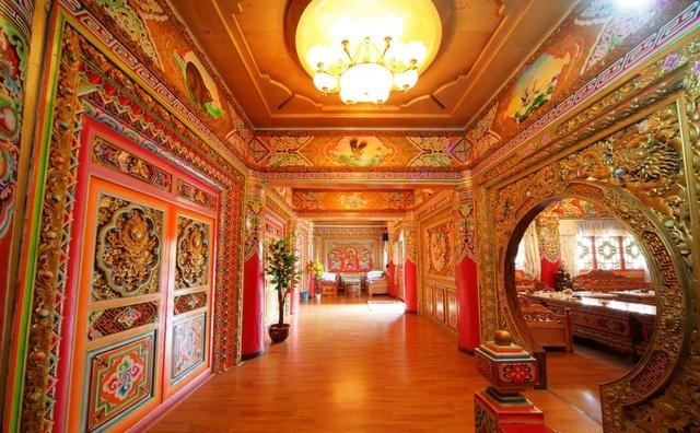 道孚民居室內精雕細鏤,描金繪彩,每一個圖案或圖畫就是一個吉祥物或一個傳說。民居客廳陳設豪華,富麗堂皇,極顯主人的富有;經堂供奉佛像,酥油燈長明,是家中的清靜之地;臥室多用箱式或椅式藏床,陳設溫馨而別具風情。