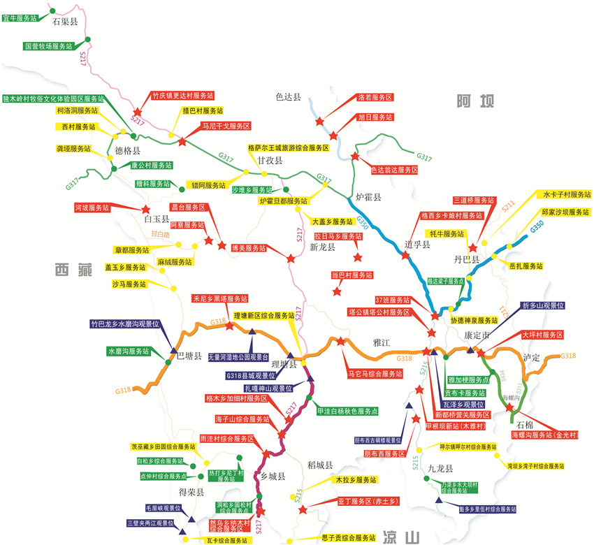 77個服務區(站、點)地處我州六條旅游線路和十條景觀大道。主要集中在:G318線(瀘定——康定——雅江——理塘——巴塘),G350線(丹巴——八美——道孚——爐霍——色達),S217線(理塘——稻城——香格里拉鎮——亞丁),S211線、S434線(瀘定——海螺溝——榆林)。