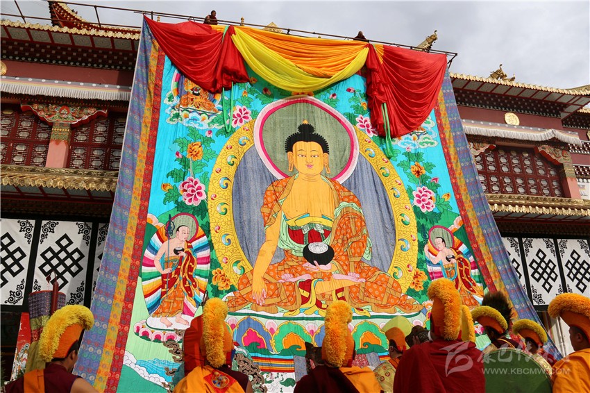 一大早,寺廟僧人身穿節日的盛裝,在莊嚴的鼓樂聲和誦經聲中,僧眾們與廣大群眾仰望佛像,隨著黃綾的徐徐拉開,氣勢恢宏的巨幅佛像展現在眾人面前,預示人們平安吉祥,風調雨順,安康幸福。