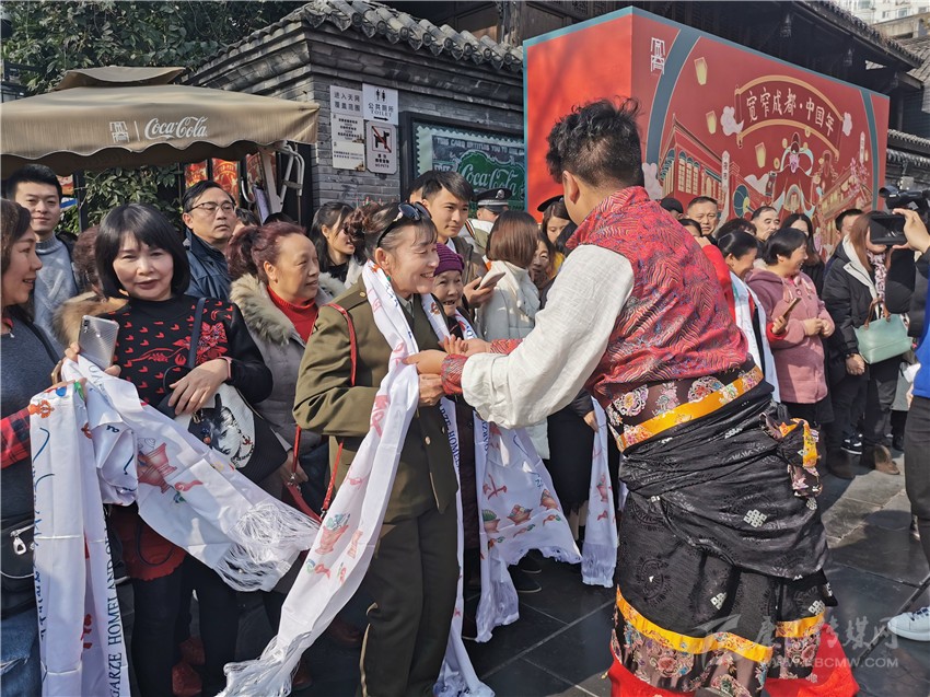 快閃還未開始,20名身著少數民族服裝的藏族姑娘小伙,便成為了一道最獨特、亮麗的風景線。隨后,他們給游客們帶來了獨具甘孜特色的歌舞《康定情歌》《甘孜踢踏》,悠揚的歌聲、奔放的舞步,讓圣潔甘孜大美天成的獨特風韻完美展顯,吸引了春熙路如潮的人群,被歌舞魅力感染,不少市民隨著他們一起唱跳了起來。而此時的成都寬窄巷子里,也正在演繹著一場震撼的“快閃”,四名穿著格薩爾王服飾的大將,身披鎧甲、手持刀劍,格外威武帥氣,市民和游客紛紛拿出手機拍照留念。“快閃”結束后,熱情的甘孜兒女為周邊的觀眾獻上潔白的哈達,向他們致以美好的祝福,并誠摯歡迎他們到甘孜旅游。
