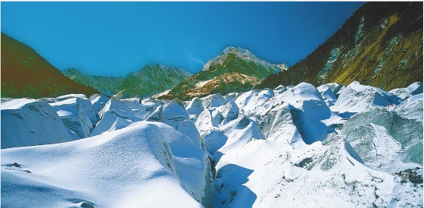 海螺溝位于貢嘎雪峰腳下,以低海拔現代冰川著稱于世。晶瑩的現代冰川從高峻的山谷鋪瀉而下;巨大的冰洞、險峻的冰橋,使人如入神話中的水晶宮。