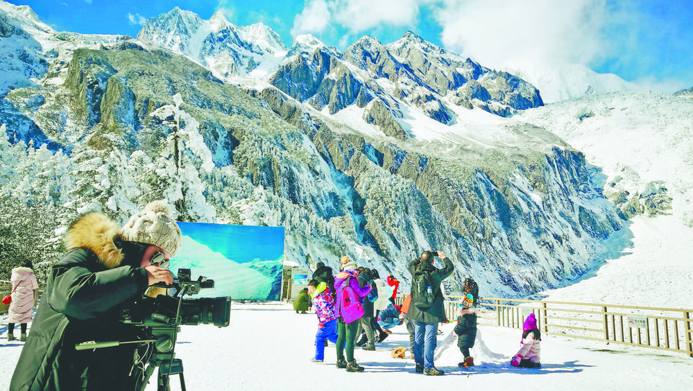 游客在海螺溝景區拍攝。