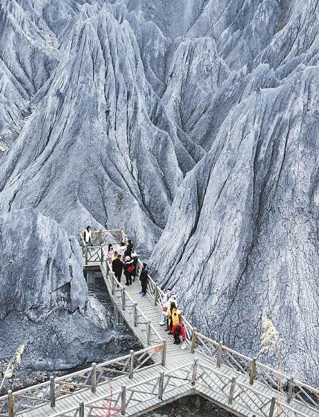 圖為11月27日,在道孚縣墨石公園,游客在素有異域星球之稱的景區游玩。