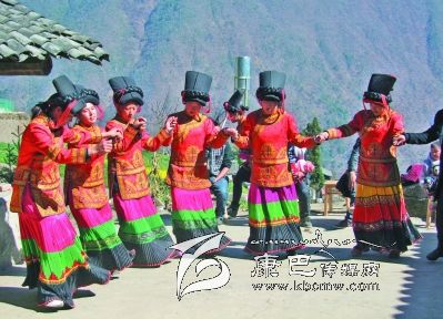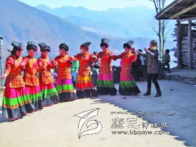 在磨西的青崗坪村,在被冰雪覆蓋的山巒眺望著的村莊,春節來臨的日子,彝家 兒女打開了彝家的美酒,燦爛的陽光搖曳濃烈的酒香,穿上紅紅的彝家服裝,彝家的女兒手拉手跳起舞。