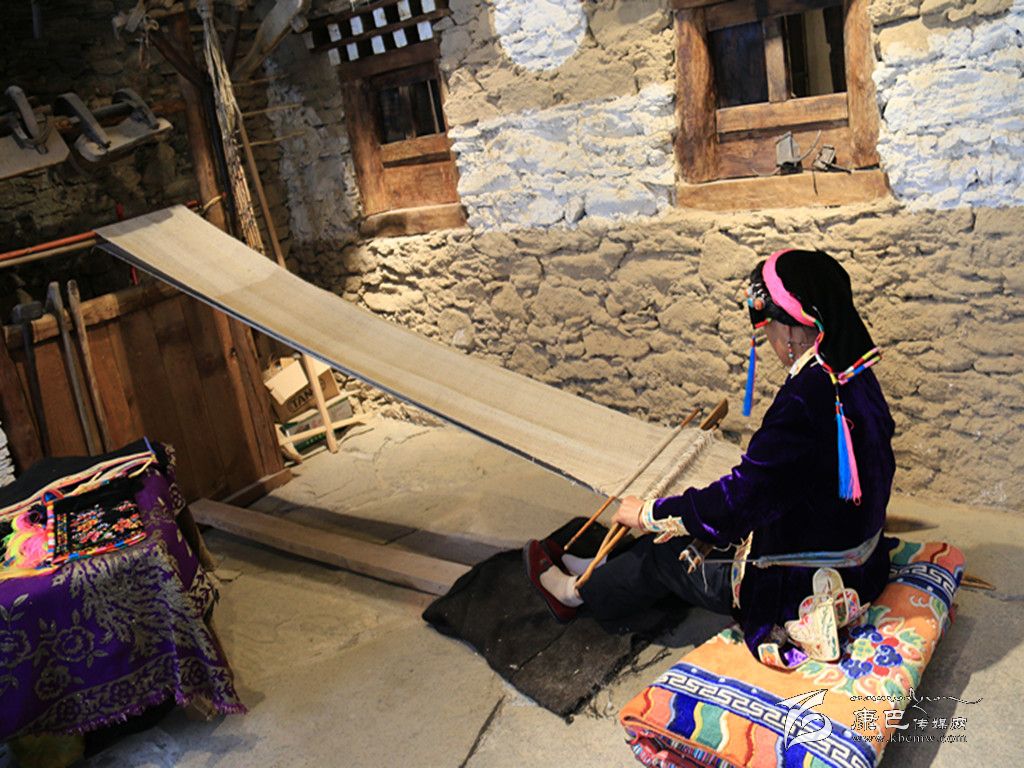 穿過古樸的大門,步入館中,映入眼簾的是古老的民間紡織技藝。一位藏族老阿媽端坐在古董般的織布機前,聚精會神地編織布匹,見到游人微笑回應,并未停下她手上的工作。年逾60的擁天秀,從十幾歲便學習織布,此間從未間斷。隨著紡織機逐漸被淘汰,擁天秀已成為傳承這門古老技藝的“活化石”。非遺展示館開館時,擁天秀主動表示,愿在此地免費為游客展示丹巴紡織技藝。 “我喜歡丹巴刺繡和紡織工藝,平時在家里也會做,現在眼睛不很好,所以刺繡沒有辦法做了。游客們很喜歡在這里看我織布,他們有什么問題,我都會給他們講解。”古老的嘉絨紡織技術,通過擁天秀的雙手,漸漸被人們熟知,無數張游人與她的合影也被傳至網絡。經她現場紡織,價值600元一匹的純手工布銷量也節節攀升,擁天秀研習多年的手工活在展示館中終于有了“用武之地”。