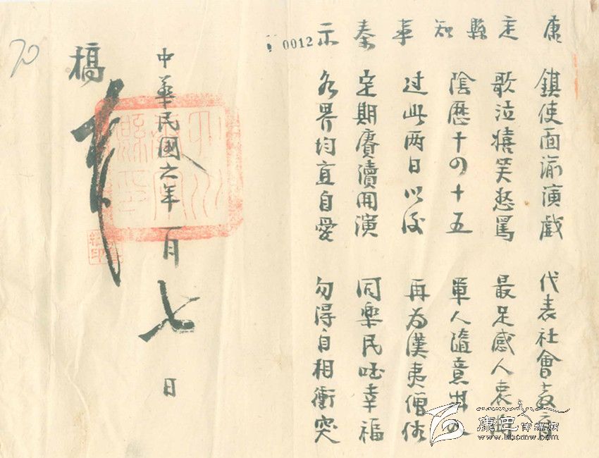 除此之外,康定縣知事又煞費苦心地再寫了一篇“順口溜”式的告示,告示上寫道:鎮使面喻演戲,代表社會教育。歌泣嬉笑怒罵,最足感人衷曲。陰歷十四十五,軍人隨意出入。過此兩日以后,再為漢藏僧俗。定期庚續開演,同樂民國幸福。各界均宜自愛,不得自相沖突。