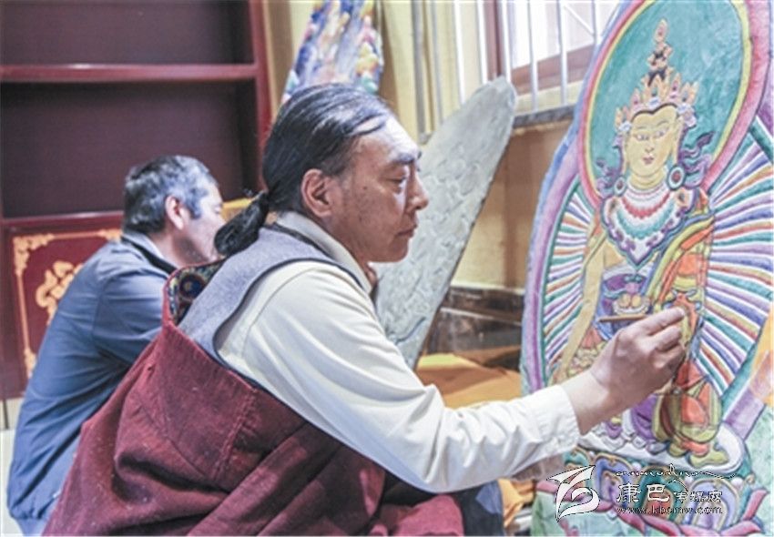 從子承父業(yè)再到吸眾家之長,自離開故鄉(xiāng)的那天起,巴德的視野開始變得開闊起來。1979年到省藏校學習藏文和美術,并開始涉獵泥塑技藝,隨后又向德格民間藝人扎西澤郎學習彩繪石刻,然后又到西藏、甘肅等地學習繪畫、石刻技藝。巴德說,自己之所以有今天的藝術造詣,是因為有一批名師指點,是因為自己的不斷探索和長期堅守。讓他欣慰的是,自己的三個兒子都在學習石刻和繪畫,親戚朋友中的十多個孩子也成了他的入門弟子。