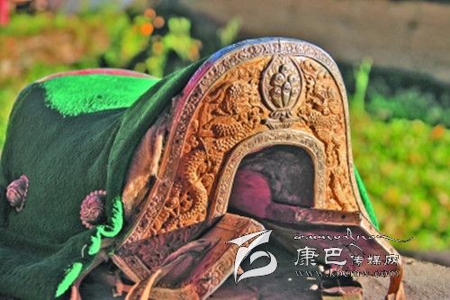 道孚縣八美鎮雀兒村拉姆收藏的二龍戲珠圖案馬鞍