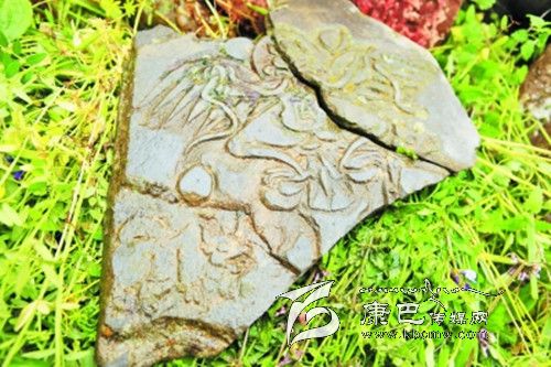 另外,今內蒙古伊克昭盟伊金霍洛旗成吉思汗陵,供奉的“成吉思汗狩獵馬鞍”上,有二龍戲珠(“如意寶”由六顆海螺束成),其下面是大鵬金翅鳥護衛牦牛圖形,這是典型的川西地區苯教圖案。2012年7月8日,調查小組一行在協德鄉古寺瑪尼堆中,也采集到大鵬金翅鳥護衛牦牛的石刻(宋代)。9月28日在協德鄉雀兒村藏民擁措家看到一副馬鞍,其上也有類似的二龍戲珠、如意寶圖形。成吉思汗的“狩獵馬鞍”是成吉思汗到過川西藏區的最有力的證據之一。