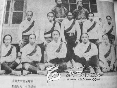 這是一張上個(gè)世紀(jì)初藏族人同英國(guó)人美國(guó)人在康巴高原踢足球的照片,地點(diǎn)是在川藏茶馬古道上的巴塘境內(nèi),從巴塘越過(guò)金沙江就是西藏地界。同樣的時(shí)間,京師大學(xué)堂(北京大學(xué)前身)建制完整的足球隊(duì)也為后人留下了一張同樣珍貴的合影照。