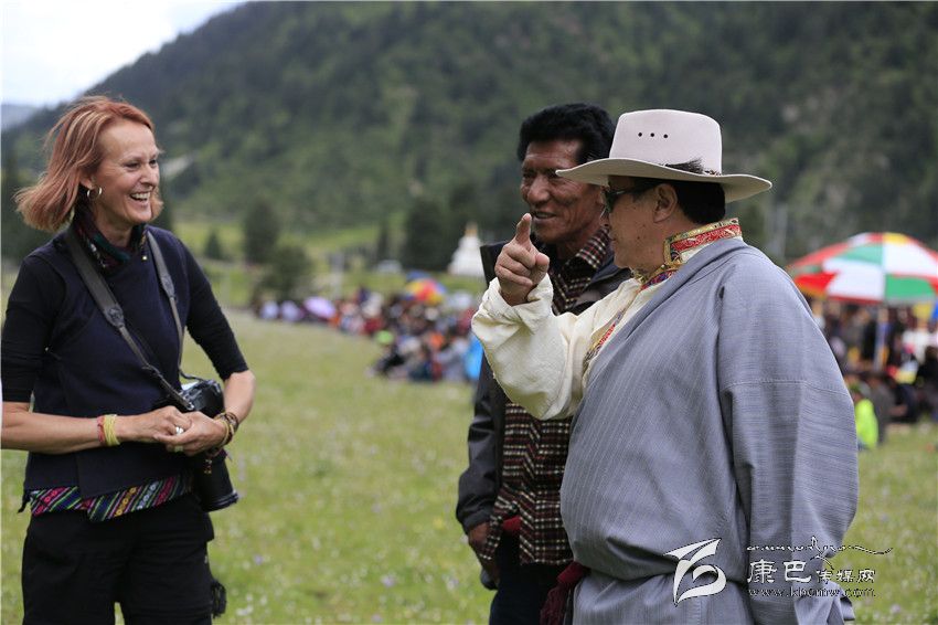 根秋扎西向國外游客介紹家鄉(xiāng)風俗。